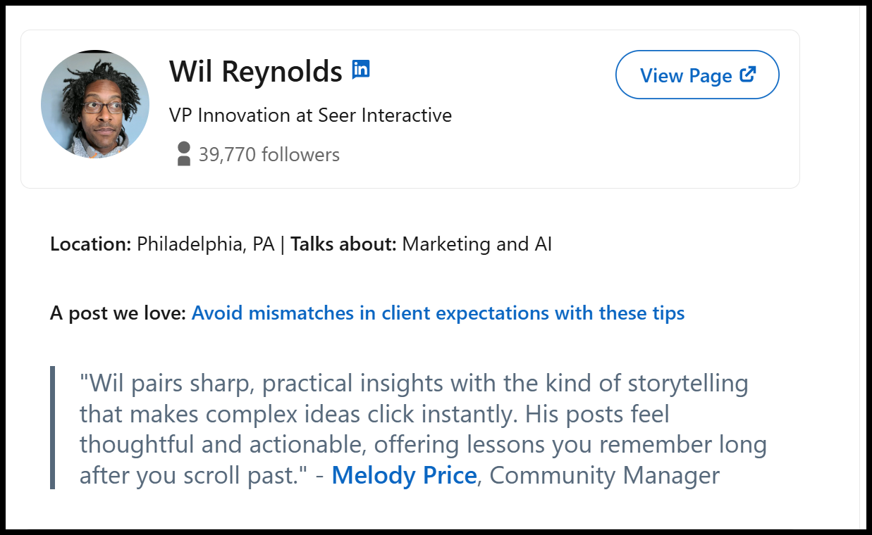 Oh and today this happened, I was selected by LinkedIn as a Top Voice. Who knows what that leads to but it is another trust signal that when they analyzed my content they thought I was worth it, for now :) Where does this show up in our KPIs? We'll find out, but I'll take it over 1,000 listicles anyday.