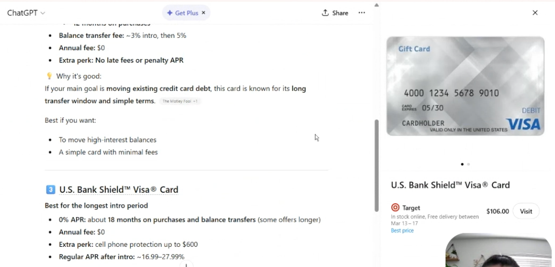 In our usability study, we found that users went to Google with brand searches or direct to brand sites to take action. We saw a user click what they thought was a link to U.S. Bank for a credit card, but instead opened a ChatGPT shopping panel to a Visa Gift card sold at Target.