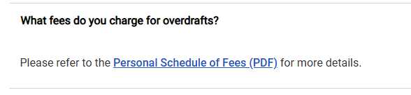 - Leads users to a 23 page PDF under the question "What fees do you charge for overdrafts" instead of clearly stating