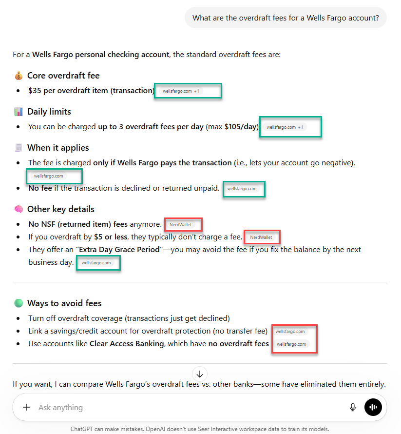 When searching in ChatGPT for ‘What are the overdraft fees of a Wells Fargo account’ and repeating the prompt for Bank of America, there were two completely different experiences.