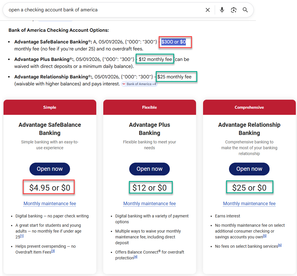 Searching “open a checking account Bank of America” shows inconsistent fee information in AIO compared to what’s on their own site.
