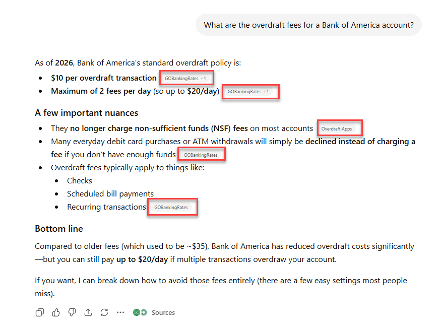 Since Bank of America is owning 0%, someone else has to fill the gap. Third-party sites like GOBankingRates can look unfamiliar and untrustworthy to users, present the wrong information, and customer engagement with Bank of America may be shaped by third-party content the brand does not control.