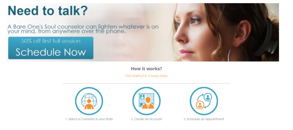 Our first client is a long-standing Seer veteran, who launched a new service line in the Fall of 2016. Bare One’s Soul is a mental health counseling service that provides phone counseling & therapy sessions with real certified licensed professionals. Based on our campaigns, we created two identical landing pages (pictured below) for two different themes. The first was tailored to a “therapy” theme and the other towards “counselors”.