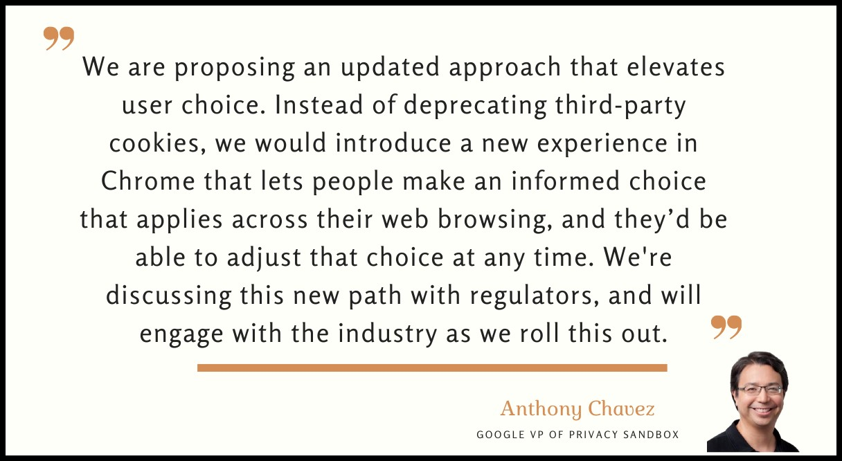 Google's pivot now allows users to opt into the Privacy Sandbox or continue using third-party cookies. Acknowledging the complexity and pushback, Google’s VP of Privacy Sandbox, Anthony Chavez, noted, “Instead of deprecating third-party cookies, we would introduce a new experience in Chrome that lets people make an informed choice that applies across their web browsing, and they’d be able to adjust that choice at any time.” Whether this feels like a batch of warm cookies fresh out of the oven is debatable, but it’s likely Google's best move given the backlash.