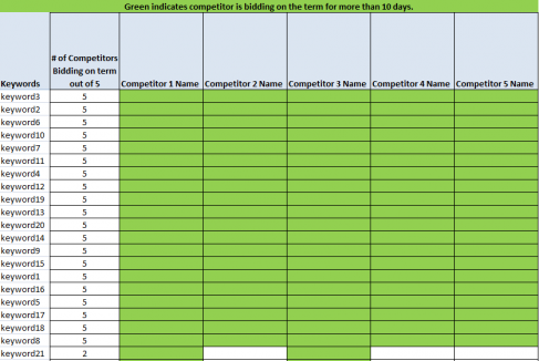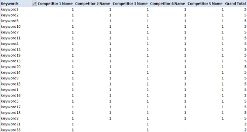 - Use keyword as the row labels, the competitor as the column data, and count of days seen as the values. This will easily show which competitor's showed up for each keyword. The Grand Total column shows a count of how many competitors are bidding on the keyword. Sort the "Grand Total" column from largest to smallest to get the most highly bided keywords at the top. See Pivot Table in attached workbook. You can actually paste your data in the raw data tab and refresh the Pivot Table.