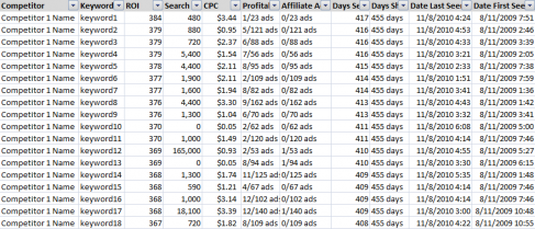- Finally, filter the data by days seen. To cut down on the amount of data, delete any keywords that were seen less than 10 days. This will eliminate many of the one off irrelevant keywords and make the file more manageable. Also, if a competitor has been seen for a keyword for more than 10 days, there is a higher likelihood this keyword is performing relatively well.