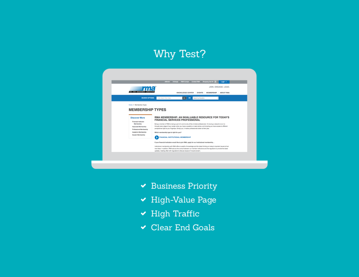The Risk Management Association (RMA) is a not-for-profit, member-driven professional association serving the financial services industry. A large part of RMA’s business relies on generating new members. Membership with RMA ensures that users have access to their exclusive, industry-leading financial expertise. Our challenge was to increase membership sign-ups via the Membership Types page on the RMA website.